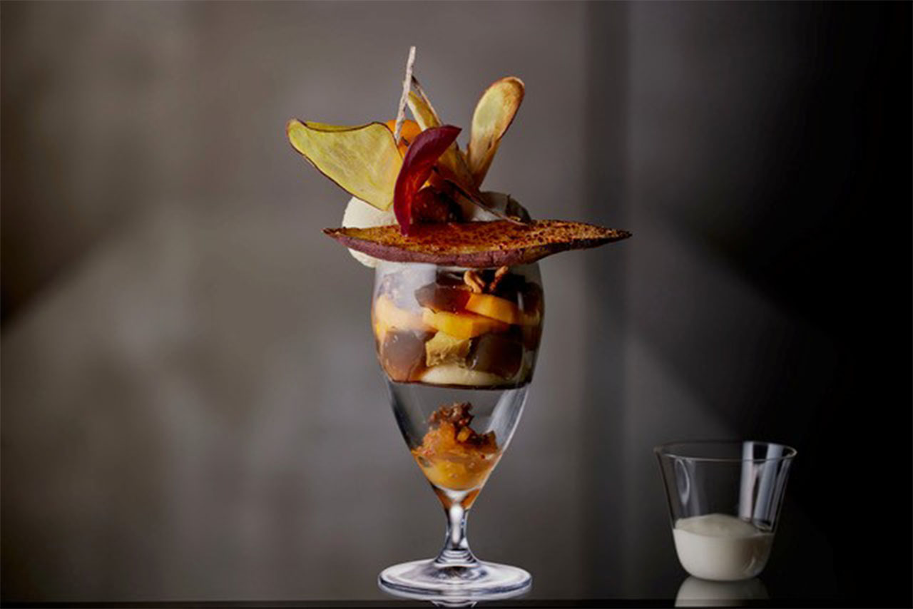 焼き芋のあたたかさと、柿の瑞々しさ。焦がし醤油や生姜の香りが、深まる秋の空気を思わせます。柿は福岡の「早生富有柿」、「富有柿」を中心に、スイートポテトやれんこん餅、柿ずいきのきんぴらなど、秋の味わいを重ね仕立てました。和の余韻と洋の甘みが幾重にも重なり、ひと口ごとに秋の景色がひろがります。