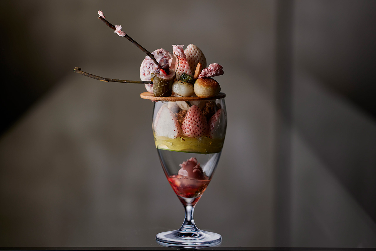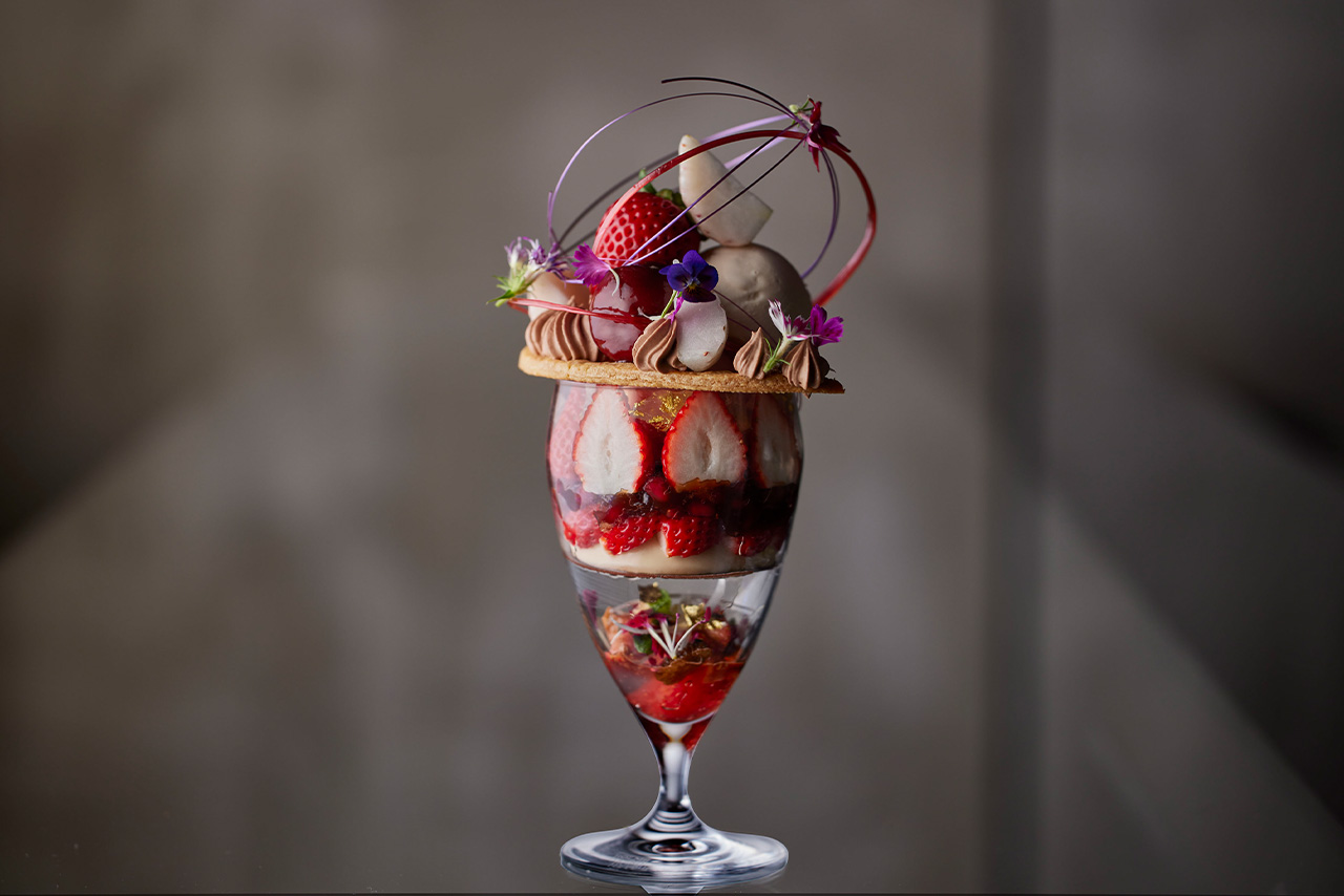 ひと口目は旬の苺の甘さ。そこからスパイス、酸、コクが重なり、味に奥行きが生まれます。スパイスミルクジェラート、白ワイン香る苺ソルベ、ザクロジュレや焼き苺、チーズとデーツまで、一層ずつ丁寧に重ねました.苺の個性を、余すことなく表現したパフェです。
