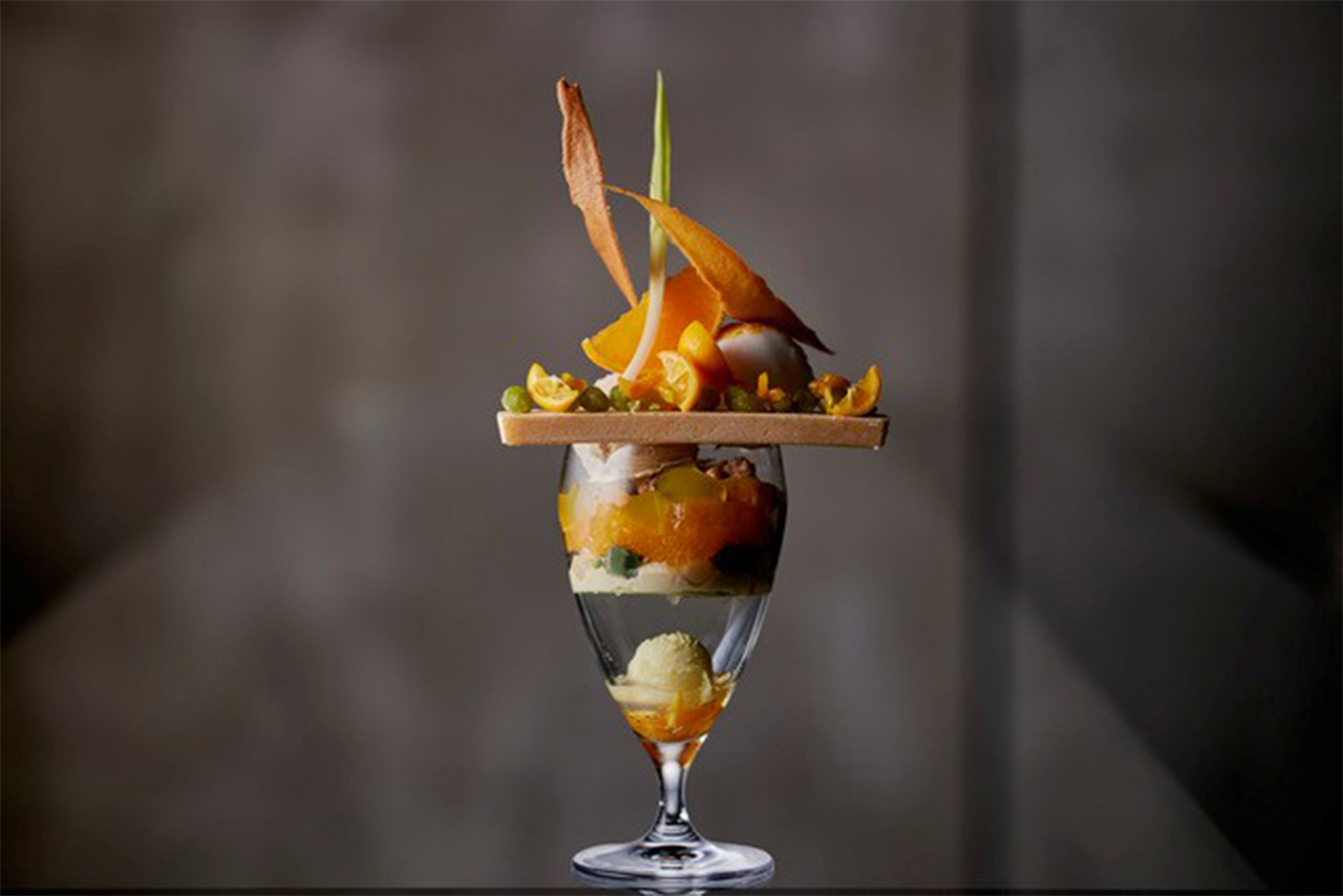 パフェの下の層から、春が立ち上がる情景を様々な旬の柑橘とともに、グラスに重ねました。目が覚めるような酸味と、土の気配のほろ苦さ。白味噌や麩、季節の山菜などの和素材と柑橘。そこに、バターやリコッタのテクスチャーを重ねました。口に運ぶたび、景色が少しずつ変わっていき、「食べ終わったあとも、季節の気配が残る。」をテーマに構成しました。